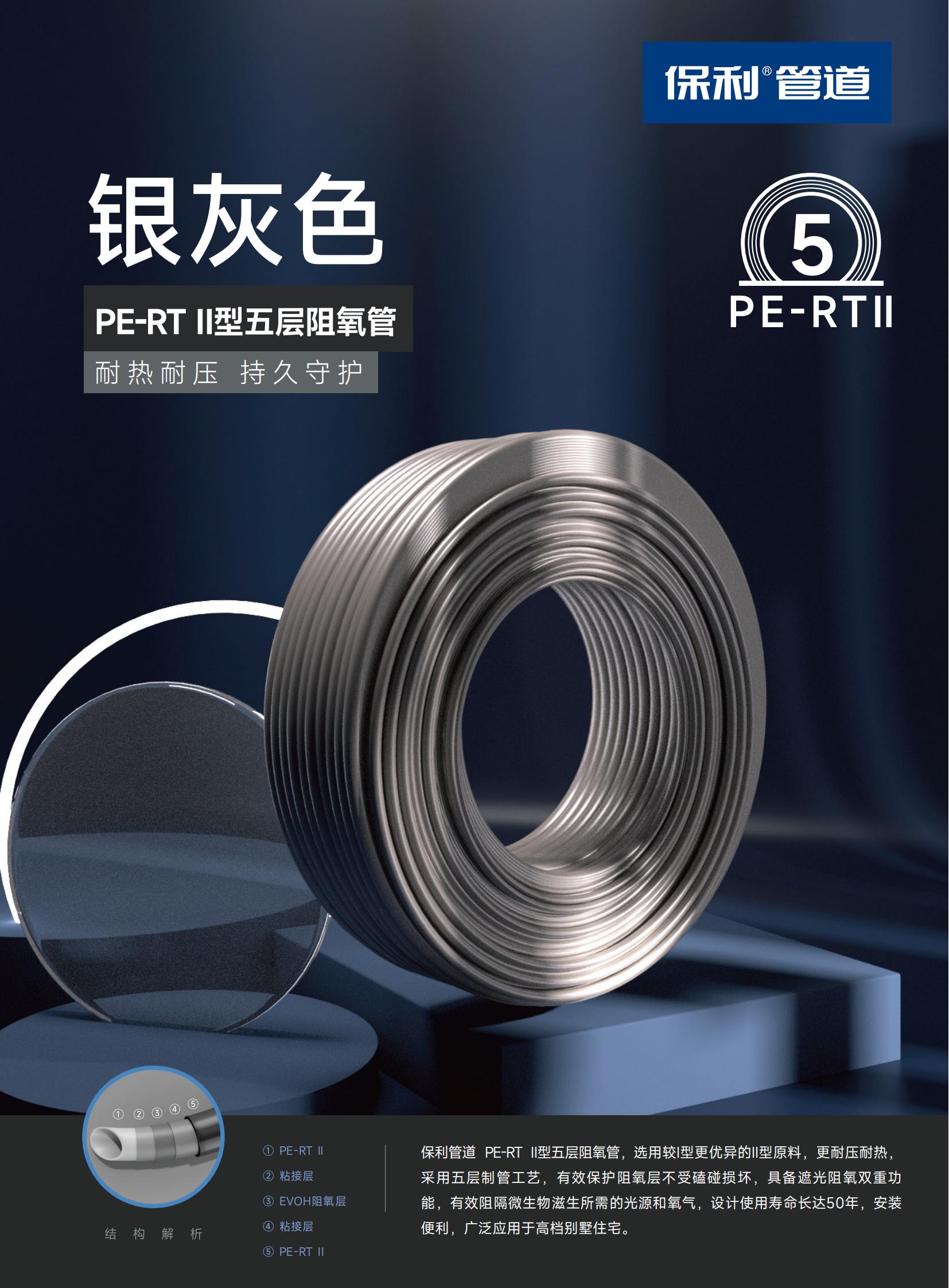 保利管道 PE-RT I型五层阻氧管,选用较I型更优异的II型原料,更耐压耐热采用五层制管工艺,有效保护阻氧层不受磕碰损坏,具备遮光阻氧双重功能,有效阻隔微生物滋生所需的光源和氧气,安装便利,广泛应用于高档别墅住宅。