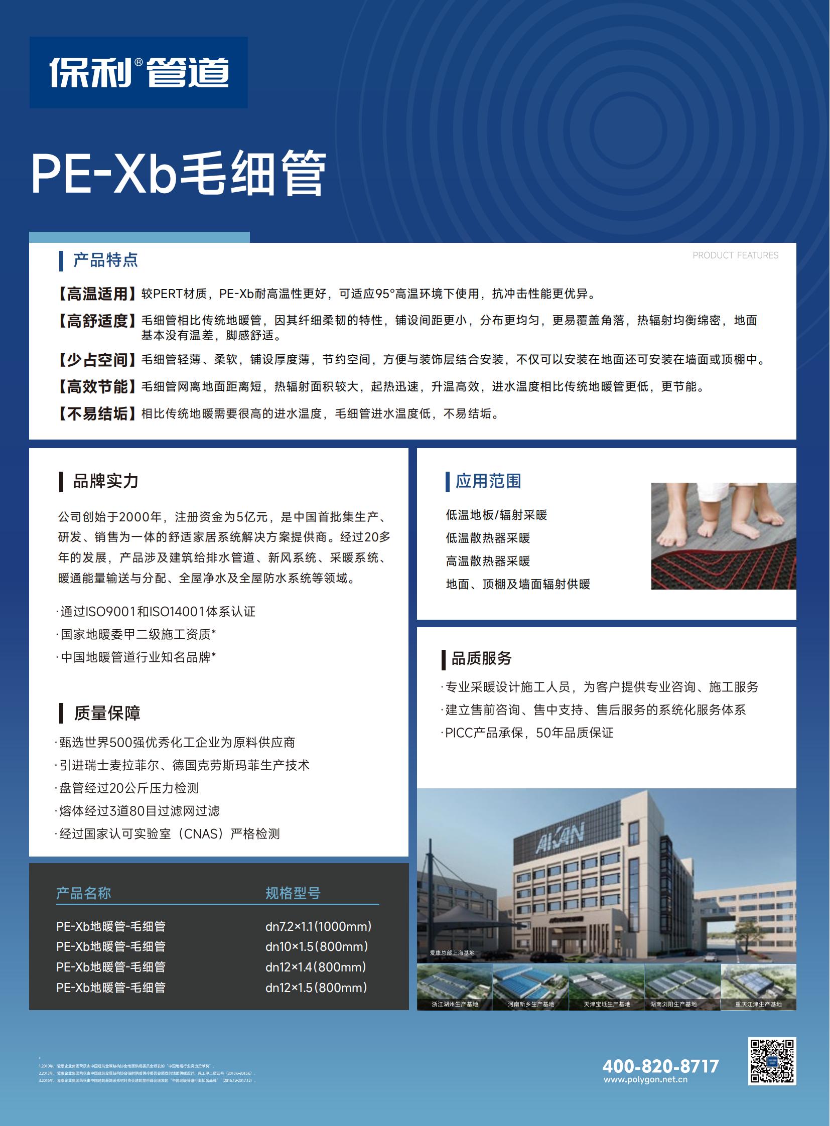 保利管道PE-Xb毛细管,较PERT材质,PE-Xb耐高温性更好,抗冲击性能更优异,无焊接节点,一管到底防漏水,铺设间距小,分布均匀,易覆盖角落,热辐射均衡绵密,起热迅速,升温高效。